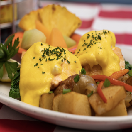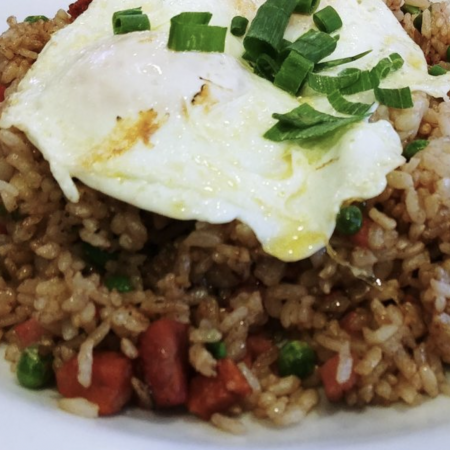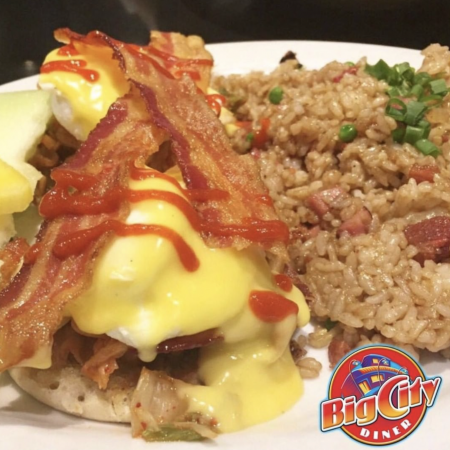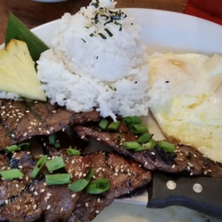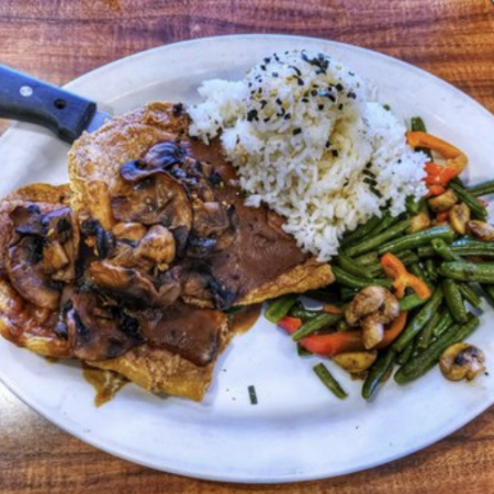 Comes with Fresh Fruit & One Choice of White Rice, Brown Rice, White Toast, Wheat Toast, Paniolo Potatoes.