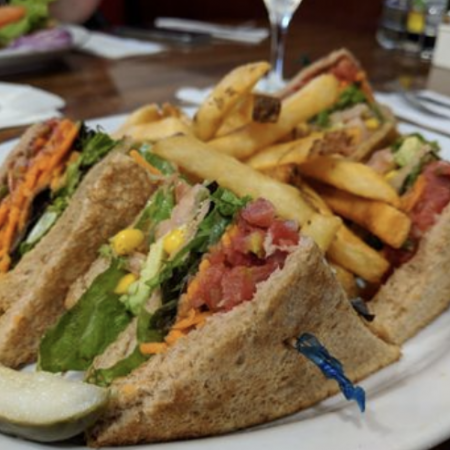 All Sandwiches come with Skin on Fries or add roasted garlic fries for $1.99. Add $5.99 for a small green salad.