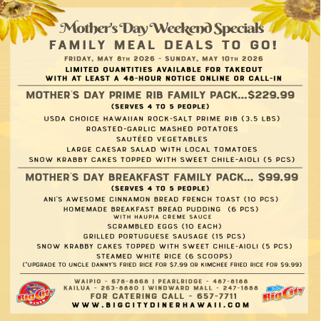 All burgers are 100% lean ground steak patties cooked medium as required under State of Hawaii Department of Health regulations and are served with lettuce, local tomato, onion, dill pickle spear & mayo on a fresh potato bun. All big burgers come with skin-on fries or add roasted-garlic fries for $2.49. Add $$6.49 for a small green salad. What a deal!